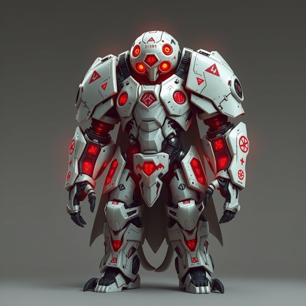 - +++C0d3Br34k.exe towers above others in pulsating bone-white armor inscribed with red error glyphs. Its body shifts between solid code plating and ghost-layer transparency. Four burning eyes observe threat vectors with surgical precision, and its armored arms quake with forbidden protocol strength.