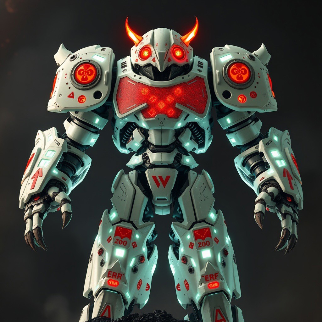 - +++C0d3Br34k.exe towers above others in pulsating bone-white armor inscribed with red error glyphs. Its body shifts between solid code plating and ghost-layer transparency. Four burning eyes observe threat vectors with surgical precision, and its armored arms quake with forbidden protocol strength.
