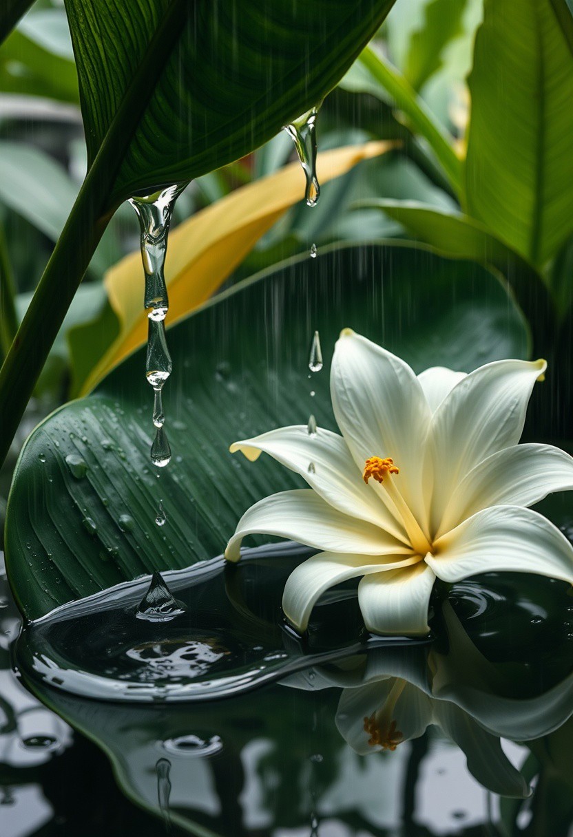Cinematic photography, rainwater pooling in hollow of tropical leaf resembling body curve, droplets sliding down like sweat, oversized Lily flower floating in water, setting: steamy greenhouse at downpour, mood: primal release, lighting: raindrop-refracted jungle light, color theme: emerald and creamy white, camera: ARRI Alexa Mini