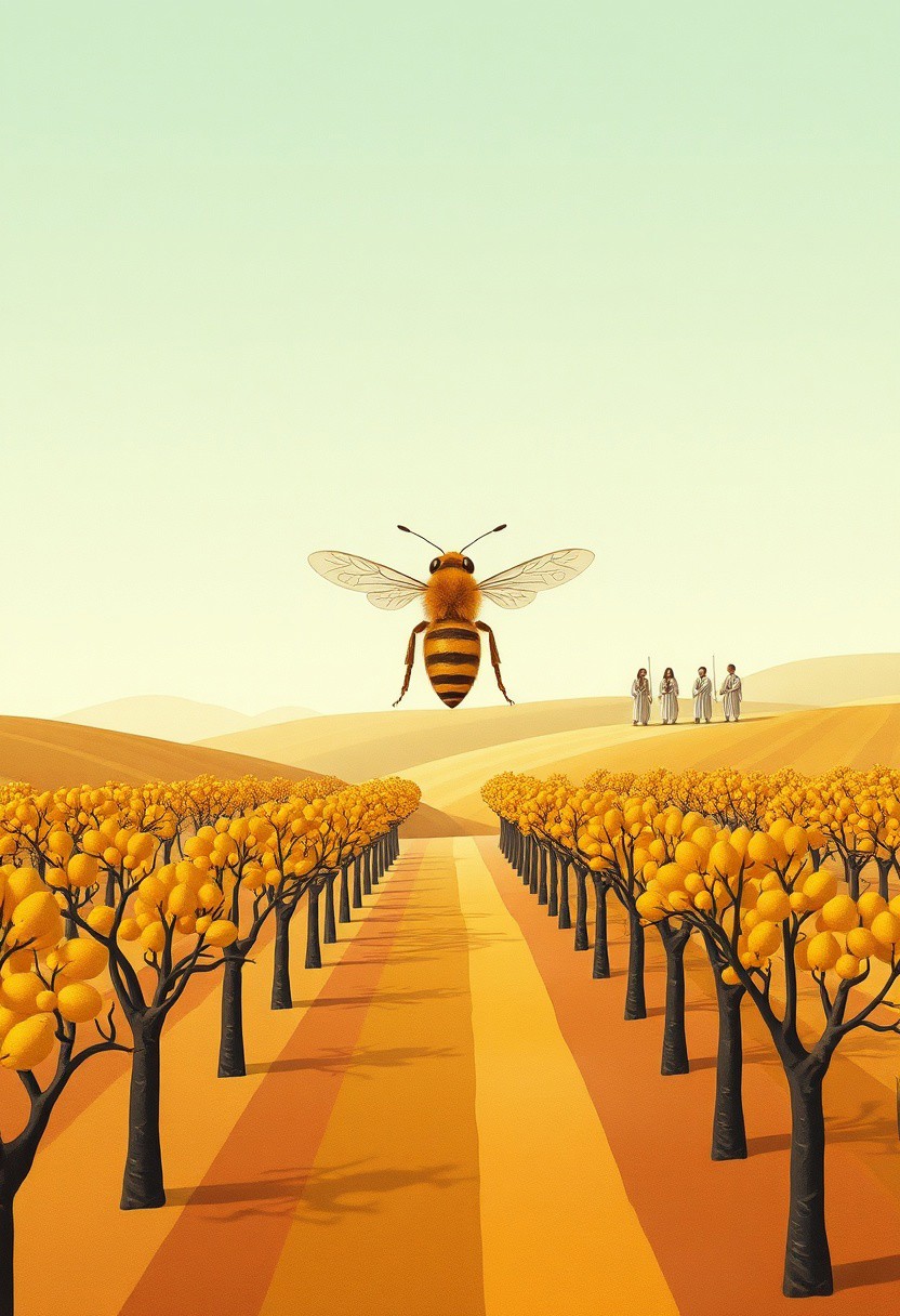 A golden bee hovers in a surreal orchard of abstracted fruit trees, their trunks arranged in mathematically perfect rows. The landscape rolls gently with stylized hills, each one painted in soft pastels and lined with elegant contours. The bee glides mid-frame, its wings frozen in a graceful motion, its body glowing with warm bronze and ivory tones. In the distance, faceless shepherd-like figures in flowing tunics gaze skyward, seemingly unaware of the bee’s sacred passage. The entire composition is framed in a fresco-like elegance, with flattened perspective and ornamental harmony. The light is cool yet luminous, casting a timeless aura over the landscape. The bee becomes a central motif in a world suspended between harmony and melancholy, its presence profound and poetic.