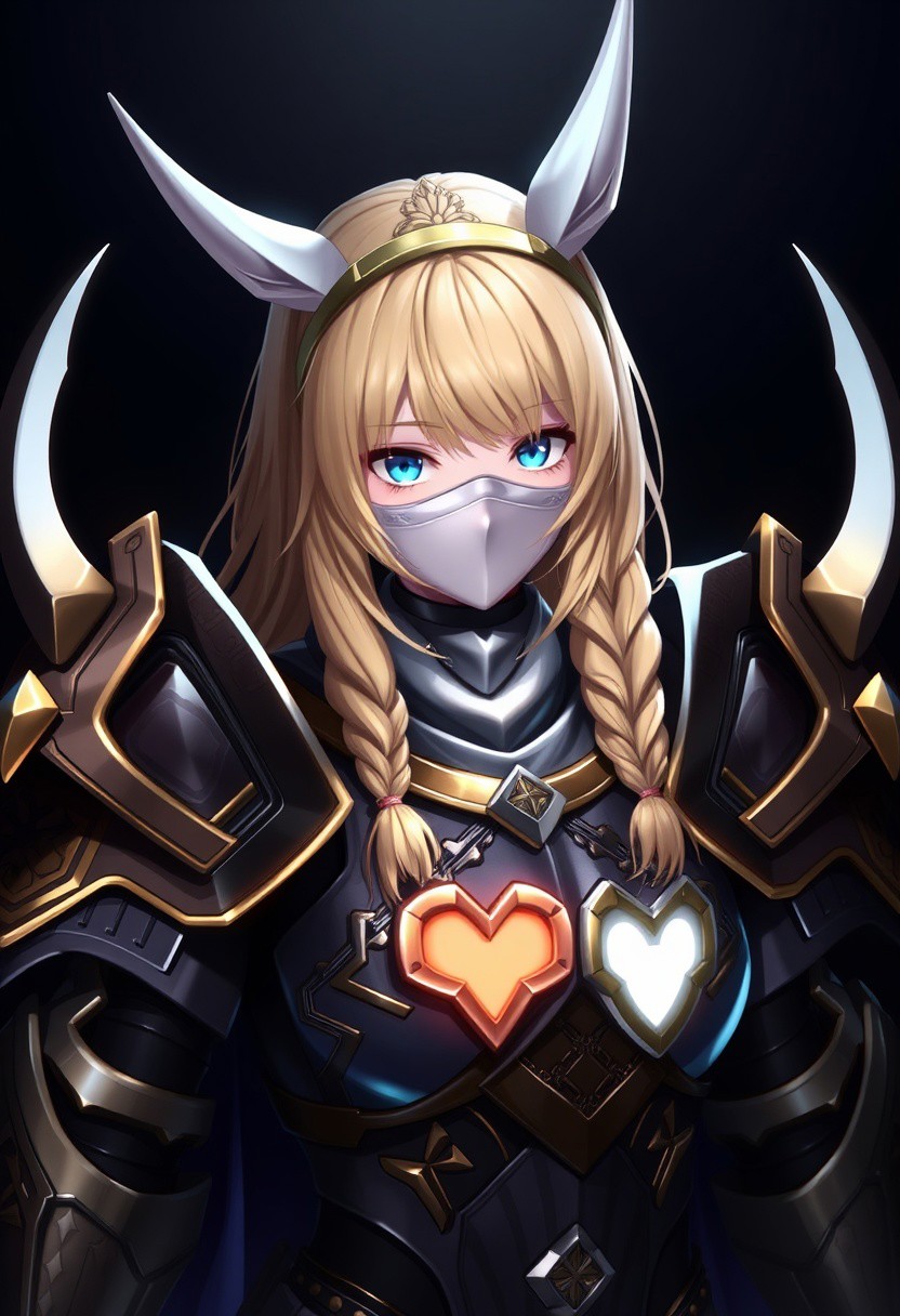 masterpiece, best quality, amazing quality, (realistic:1.3), 1girl, blonde hair, crown braid, (horns:1.4), armor, pauldrons, (gauntlets:1.1), gold trim, glowing heart, faceless mask, white mask, (looking at viewer:1.2), blue eyes, expressionless, WCG-Illu, dark background, sidelighting, atmospheric perspective, dim lighting, underlighting <lora:Knight_Armor_for_Pony_V2:0.85> <lora:Exp._Warframe_CGI_Illu_Edition:0.35> <lora:Dark (Illustrious) v1:1>