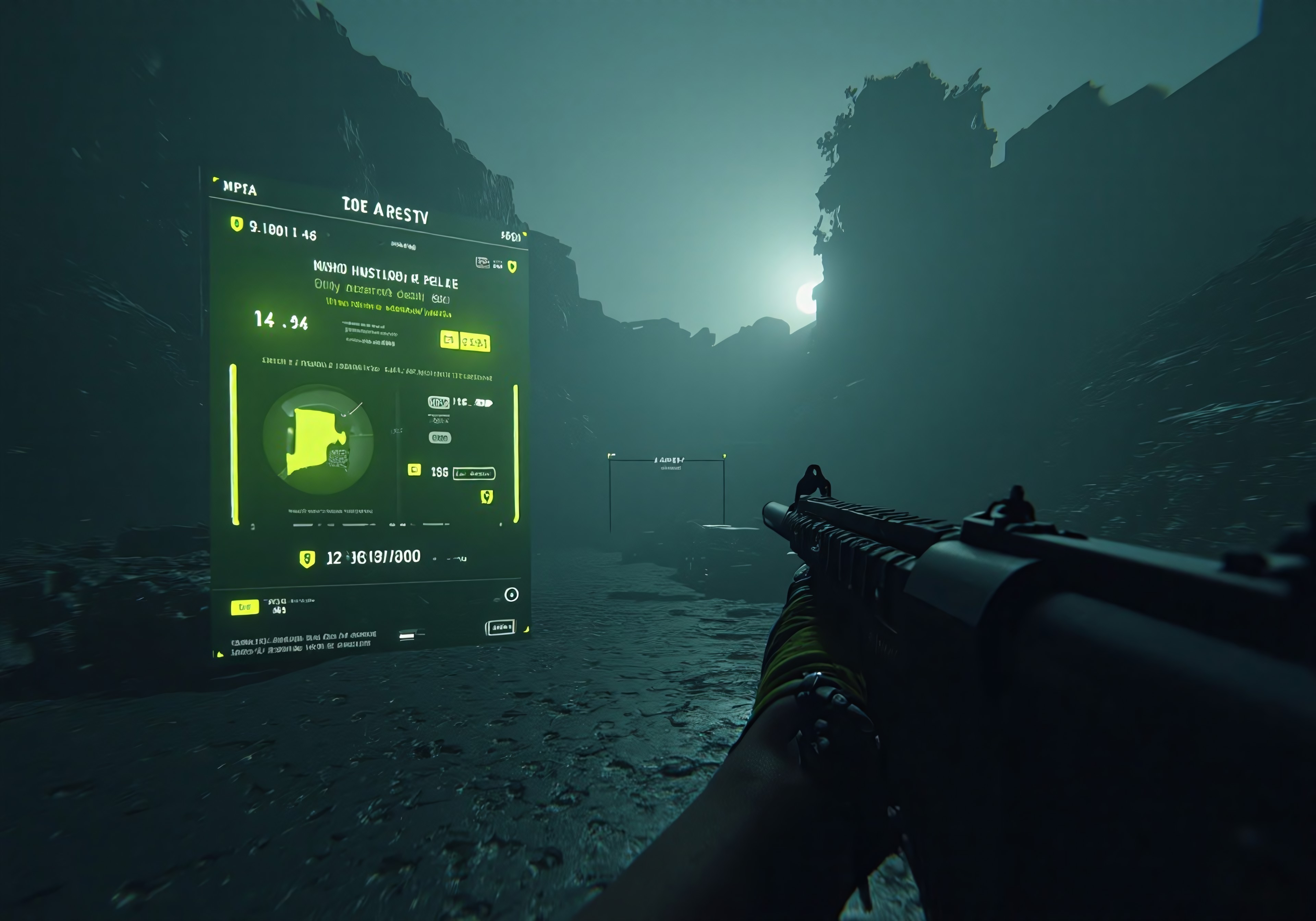 Cinematic scene, futuristic mix world war, action cam, realistic dim lighting. HUD vision view, Light Yellow mix green vision view, battle info screen, Life parameters, signal monitoring. Foreground: handing gun. Background: battleruins city, detroyed city, trench warfare, iron mesh, battle bunker. Thermal light enemies, wwi uniform.