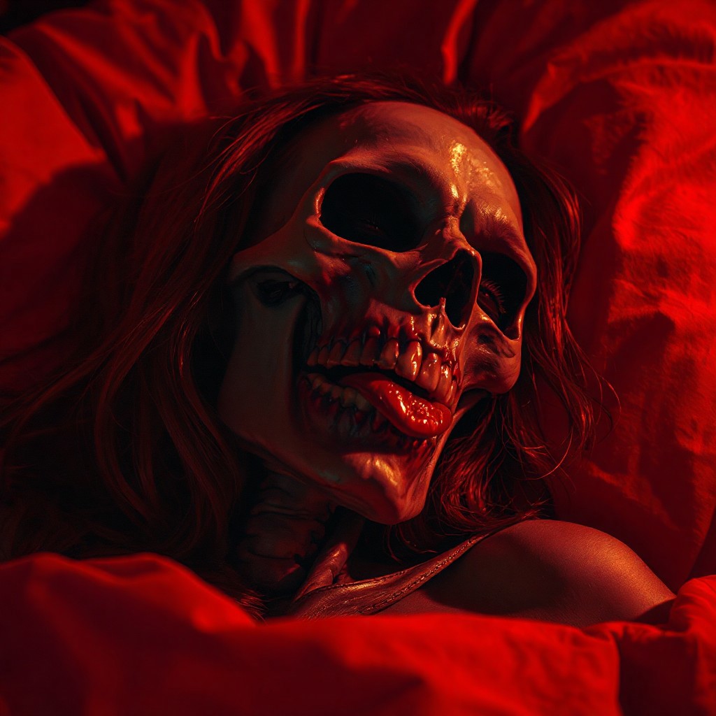 Album cover of realistic Dark art close up movie still of a undead zombie woman from the 70s-style pulp paintings lying in bed in a eerie red hotel room licking her necrotic lips with a naughty look on her face, The vibe is red and otherworldy. The zombie womans skeletal face is looking blissful. Duotone: Burnt orange and deep plum. Mood: Occult ritual meets 80's concert poster art style, movie still, gore, sexy, flirty, amorous, beautiful, evil dead
