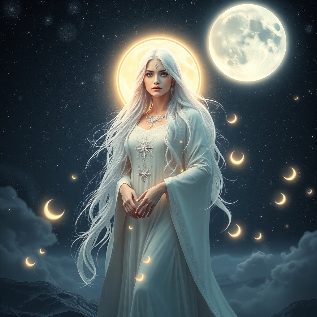 A majestic and ethereal Moon Goddess standing under a star-filled night sky. She has radiant pale skin that glows softly like moonlight, long flowing silver or white hair, and eyes that shimmer like the cosmos. She wears an elegant celestial robe adorned with stars, constellations, and moon symbols. A luminous full moon hovers behind her like a halo, casting a soft, silvery glow. Her presence is serene and divine, surrounded by floating stardust, misty clouds, and glowing crescent-shaped ornaments. The background features a cosmic landscape—craters, stars, and nebulae. Fantasy, divine, ultra-detailed, dreamlike atmosphere, high-resolution.