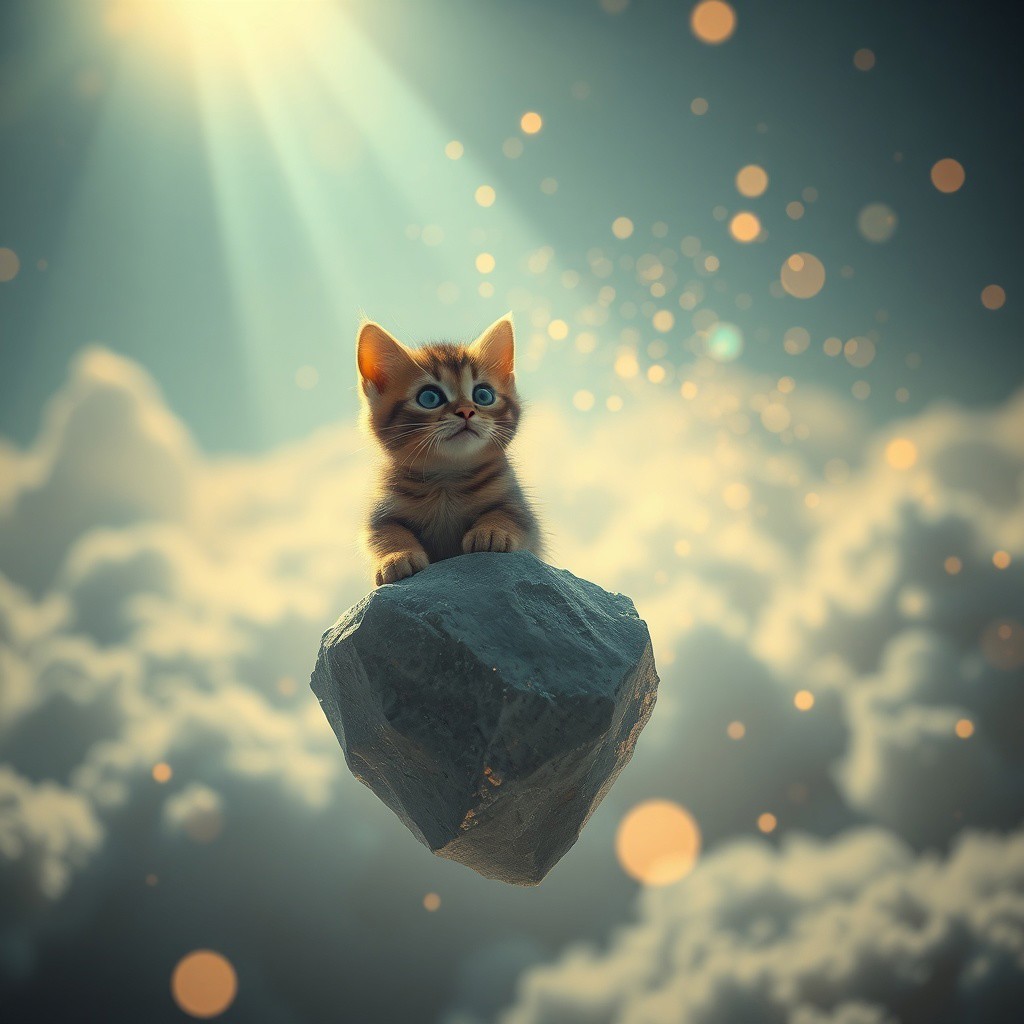 A cinematic high-angle shot captures a tiny, adorable cat perched serenely on a floating, crystalline rock amidst a surreal dreamscape. Volumetric light rays from an unseen source pierce through ethereal clouds, illuminating a whirlwind of glowing, magical particles that dance in the air. The shallow depth of field creates a beautiful bokeh, with every intricate detail of the cat’s fur in sharp focus, while subtle lens flare and chromatic aberration add a photorealistic quality. The cat’s curious eyes, reflecting the scene, seem to hold the secrets of this impossible, glowing world.