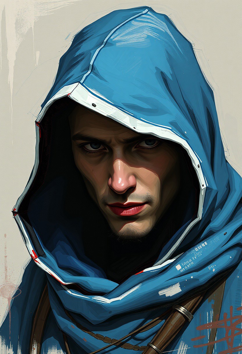 Hooded wizard, blue hood, white trim, rendered with bold, expressive smudges and unfinished strokes, art nouveau, painterly