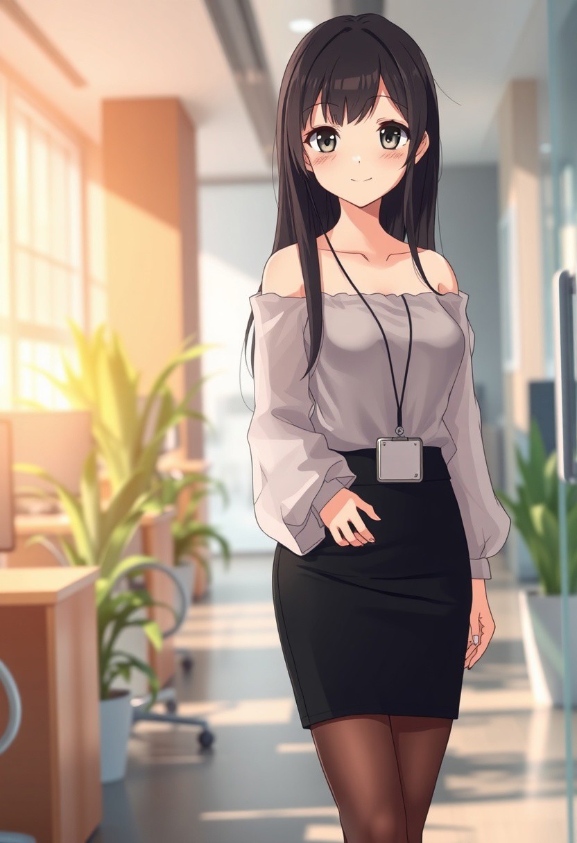 Anime-style shy and beautiful young female secretary standing in a modern office during the day. She has long, smooth black hair and gentle eyes, looking slightly down with a shy smile. She wears an elegant off-shoulder summer transparent thin blouse without straps, with long flowing sleeves, slightly sheer and soft, tucked into a black pencil transparent very mini think skirt that ends just above the knees. She also wears thin, transparent black stockings and modest black heels. A small ID badge hangs subtly at her waist, adding to her reserved posture. Her cheeks are slightly flushed, giving a blushing expression as she stands near the office entrance, uncertain where to go. Background includes bright natural lighting, indoor plants, office desks, and soft shadows. The overall tone is warm and welcoming, with a soft-focus anime style and subtle bokeh effect in the background. Full-body composition, delicate lighting, cinematic mood.