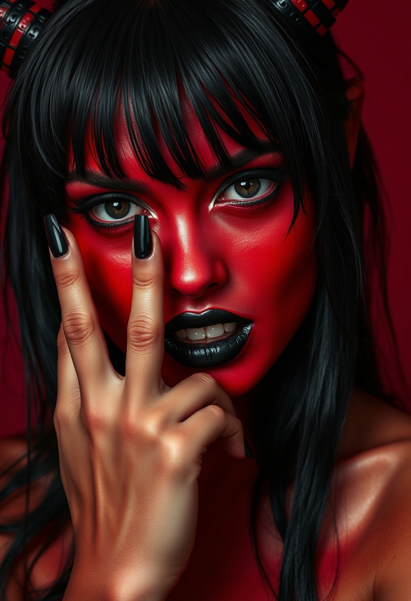 Portrait of a 36 year old beautiful bright red skinned female with deep wet sweaty Her face looks demonic although pretty . She jet black shiny hair with bangs , the hair that is styled to slightly resemble a succubus’s horns. Their skin is shiny blood red Their pupils are black onyx colored and look slightly inhuman teeth with elongated canines , gloss black lipstick that looks moist and wet and is dripping blood . Sexy and sensual as if enticing the viewer with one hand becoming with a finger. Her long sharp fingernails are shiny onyx black