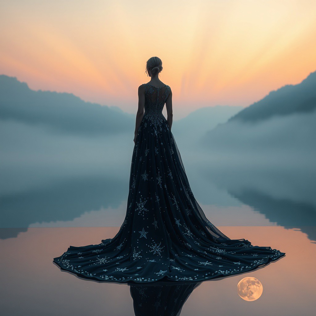 A cinematic full shot captures a woman standing at the edge of a glass-still mountain lake as twilight deepens. Ethereal, volumetric shafts of moonlight pierce through the rising mist, illuminating her breathtaking evening gown of cascading midnight silk. The gown is covered in intricate, starlit embroidery and delicate beading that creates shimmering reflections on the water's obsidian surface. The atmosphere is one of profound, magical tranquility, her perfect reflection a ghostly twin in the silent depths below.