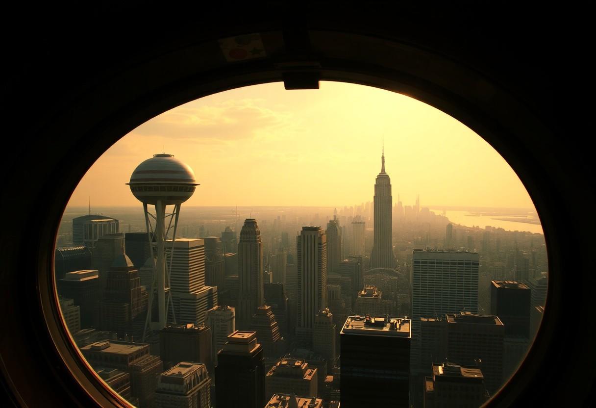 Spaceport, city view, new york, city skyline, retro,