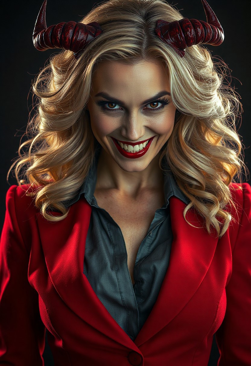 Portrait of a 40 year old beautiful female in a crimson red business suit, grey blouse with deep freckled cleavage, She has big blonde hair that is styled to slightly resemble a succubus’s horns They have a spray tan that is overdone. Their pupils are black onyx colored and look slightly inhuman with a reddish tinge . The background is also dark, emphasizing the formal attire and creating a dramatic, sophisticated mood. The overall tone is professional and serious. This person looks sinister despite being pretty with a slight fill light from below. They radiate menace and have an evil smile with an open mouth that shows overly bright teeth with elongated canines as if demonic , blood red lipstick that looks moist and wet