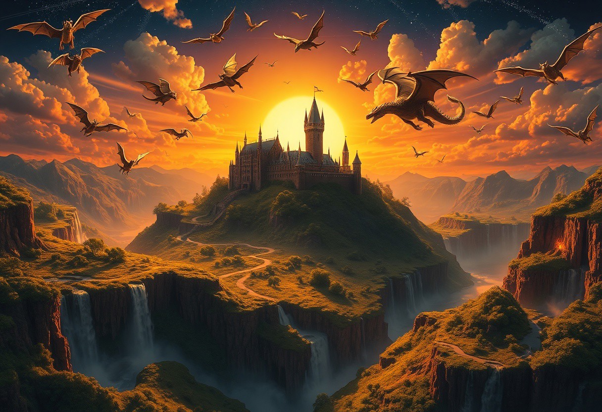 A fantastical landscape, depicting a majestic castle nestled amongst floating islands. Dragons and winged creatures soar through a vibrant sky filled with clouds and stars. The setting is a sunrise over a valley with winding roads and lush vegetation. The castle is large and intricate, with numerous towers and battlements, situated on a high hilltop. Floating islands, covered in greenery, cascade down cliffs that form waterfalls. The colors are warm and golden, emphasizing the light of the rising sun, while the background incorporates deep, dark shades. The overall composition is symmetrical and majestic, giving a sense of wonder and adventure. The perspective is a high-angle view, looking down upon the entire scene. Dragons in various sizes and poses are flying through the sky and landscape. There are signs of fire and glowing light in various parts of the scene, suggesting some magical activity. The style is dramatic and evokes a sense of fantasy and wonder.