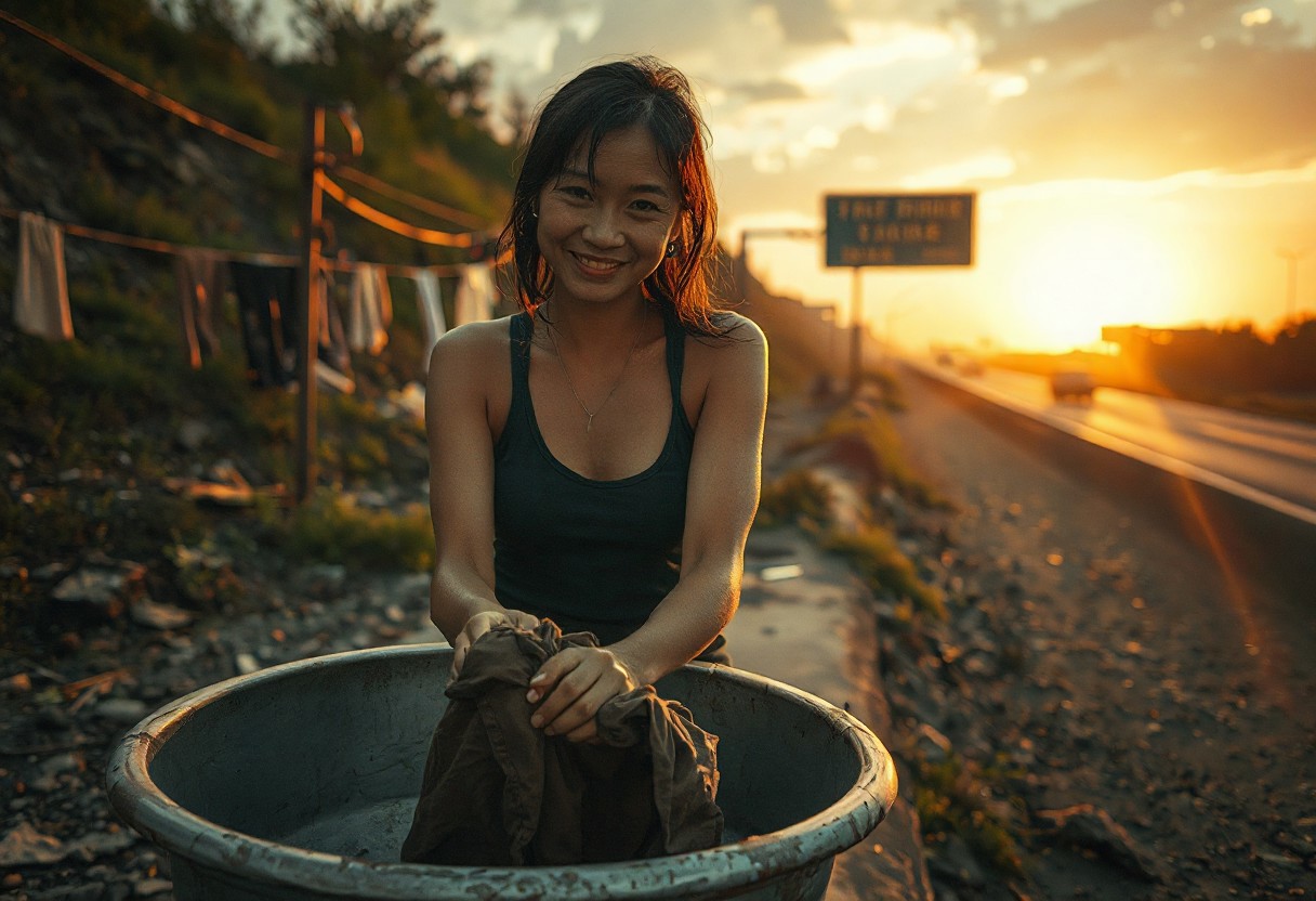 cinematic wide shot, a ruggedly dressed East Asian woman washing clothes in a metal basin by a cracked highway, post-apocalyptic sunset casting golden streaks, her tank top slightly damp, sleeves rolled up revealing toned arms, smirking at the viewer while wringing out a shirt, setting: overgrown ruins with makeshift clotheslines, mood: playful survivalism, lighting: warm dusk with volumetric dust, shot on ARRI Alexa, inspired by 'Mad Max' meets 'Memories of a Geisha'