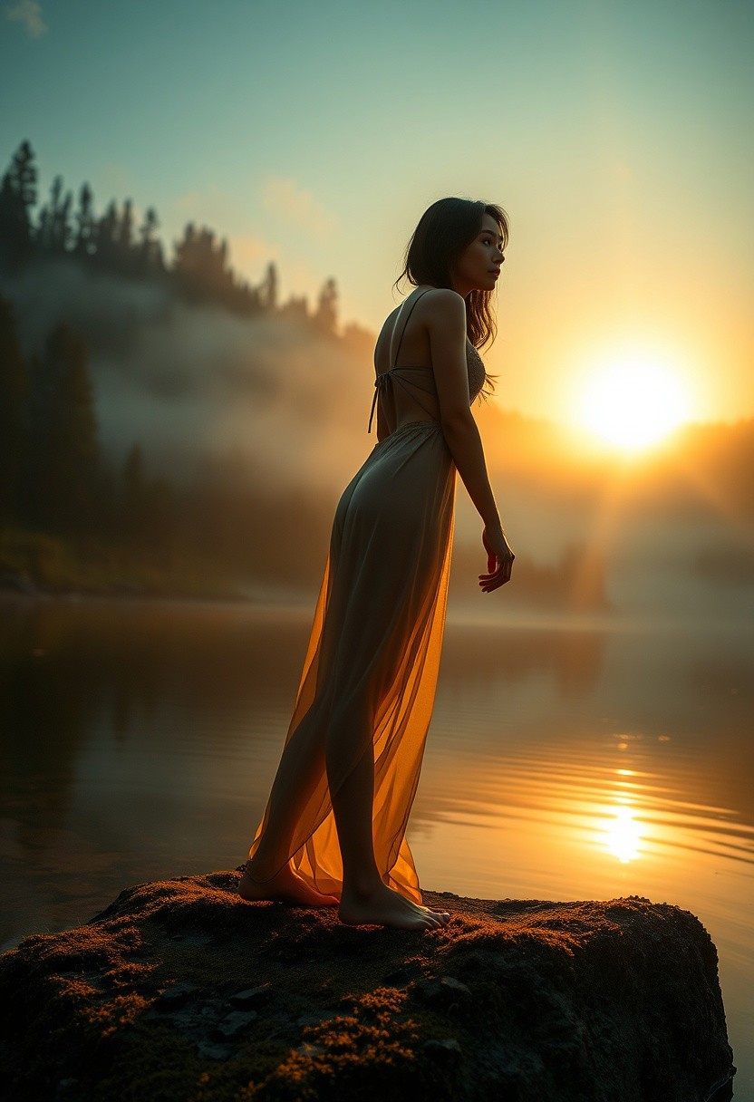 Cinematic fine art photography, beautiful Asian woman with golden-brown skin standing on mossy rock in mountain lake, atmospheric golden hour lighting, silhouette with subtle reflections in still water, wet silk chemise clinging to form, serene expression gazing into sunset, low-angle perspective emphasizing elongated figure, full-body framing, setting: misty alpine lake surrounded by pine forests, mood: tranquil eroticism, lighting: backlit sunset with rim glow, color theme: burnt amber and deep teal, camera: Hasselblad X2D, in the style of Fan Ho's poetic realism