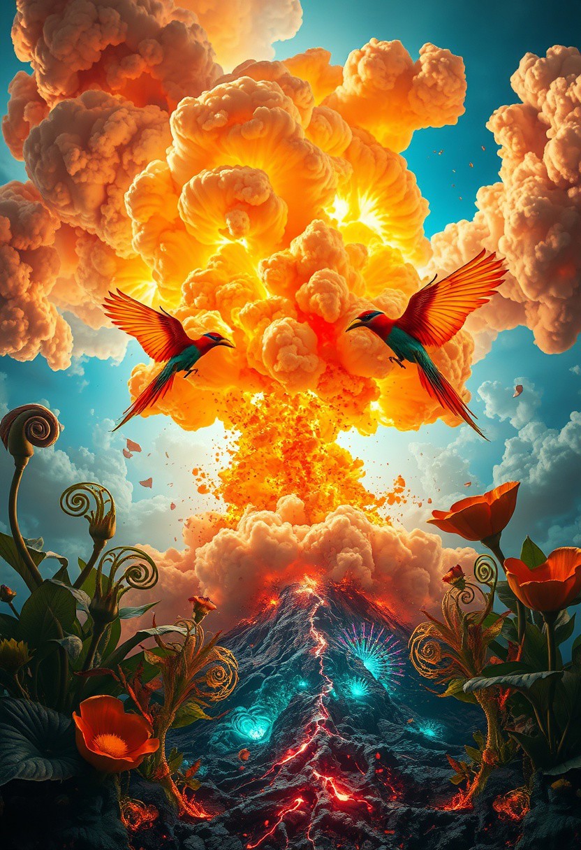 A surreal explosion captured mid-burst, where clouds of fire and smoke twist into intricate floral patterns, each petal-like plume rendered with meticulous botanical detail. Vibrant exotic birds, startled by the blast, arc outward with wings fully extended, their feathers sharply defined as if caught in a hyper-real moment of chaos and beauty. In the foreground, strange hybrid plants bend from the force, their leaves curling into iridescent spirals, glowing from within as if energized by the shockwave. The ground splits open to reveal surreal, luminous roots resembling veins of molten crystal, connecting earth to sky. Colors shift from blazing oranges and crimsons to deep emerald greens and cobalt blues, creating a dreamlike yet scientifically precise atmosphere. The moment feels both violent and sacred, like witnessing the creation of a new ecosystem born from destruction, frozen in a moment of impossible clarity and surreal symbolism.