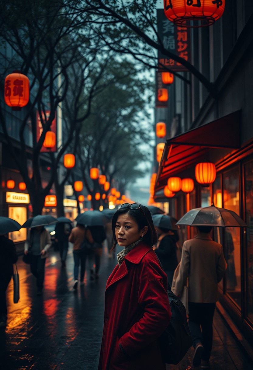A bustling city street at dusk, illuminated by the soft orange glow of lanterns reflecting off rain-slick pavement, capturing an intricate mix of human activity and natural serenity. People carrying umbrellas weave through the narrow streets, their silhouettes fragmented by overlapping shadows and refracted neon signage, while a soft mist drifts in from a distant harbor. Towering trees along the edge of the street create a dramatic canopy, their wet branches catching the faint shimmer of lamplight. A woman in a deep crimson coat pauses under a storefront awning, her expression calm yet introspective, framed by delicate light beams breaking through the haze. The atmosphere feels cinematic yet painterly, blending vivid urban life with a tranquil sense of quiet, as if caught between fleeting moments of chaos and peace. A shallow depth of field creates soft bokeh in the background, amplifying the layered perspective and emotional complexity of the scene.