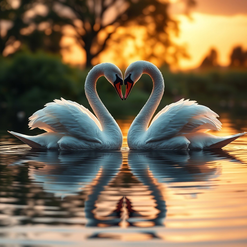 Two elegant white swans forming a heart shape with their necks, gently floating on a calm, reflective lake during golden hour. The water glistens softly with the colors of the sunset — pink, orange, and light gold — enhancing the romantic atmosphere. A few delicate water lilies surround them, and the soft ripples reflect the heart shape perfectly. Lush greenery and blurred distant trees frame the background. Realistic style, high detail, soft natural lighting, serene and romantic mood.