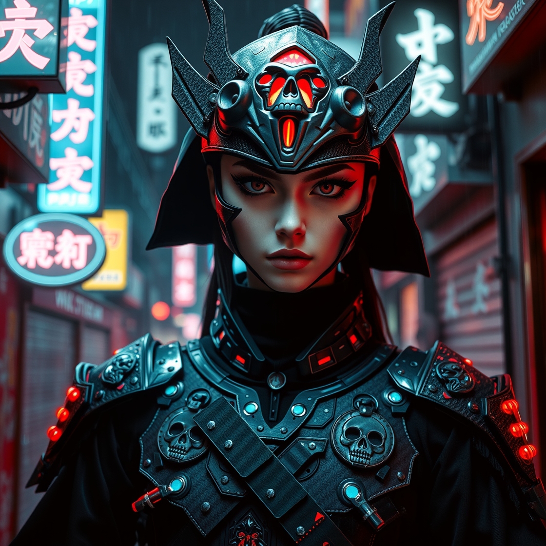 A photorealistic full-body vertical portrait of a fierce goth vampire samurai girl with pale skin and sharp, aggressive features, set in a dystopian Neo-Tokyo inspired by Blade Runner. She has intense goth makeup with heavy black eyeliner and dark eyeshadow, and a cold, defiant gaze. Her mengu mask is gothic and futuristic, with skull motifs, spiked edges, and glowing engravings in neon red and electric blue. Her samurai armor blends tribal and cyberpunk influences: black carbon fiber plates, crimson LED accents, turquoise circuitry, and angular, tech-enhanced design elements. She stands confidently in a rain-slick neon-lit alley, surrounded by holograms, mist, and glowing kanji signage. The atmosphere is dark, cinematic, grainy like 16mm film, and full of cyberpunk tension. No text or letters appear in the image. The atmosphere is moody and cinematic, with soft bokeh, dramatic lighting, and a grainy 16mm film look. Highly detailed, rich in emo and goth influence, with no text or letters in the image. Simulating Kodak Ektacolor Pro 160, with a custom white balance at 5500K. cinematic lighting, analog film, film grain, kodak chrome, cool cinematic tones,high contrast, sharp details, with moody lighting that adds depth,. (cinematic atmosphere:1.3), deep photo, depth of field, (black hair)), , (ambient occlusion), (cinematic lighting:1.3), (4K image quality:1.3), (sharp detail:1.3), (highly realistic:1.3), (dim warm cinematic lighting:1.3)