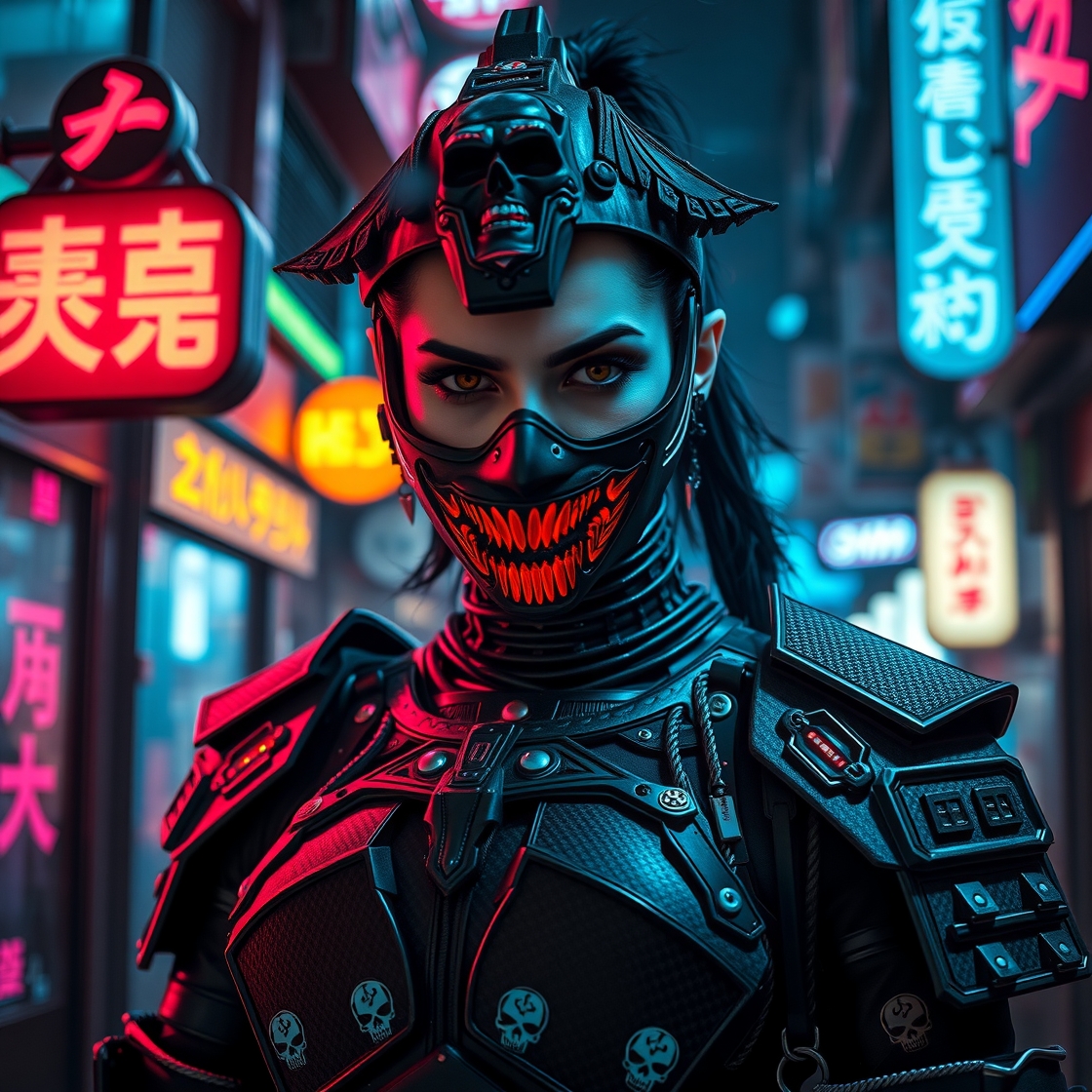 A photorealistic full-body vertical portrait of a fierce goth vampire samurai girl with pale skin and sharp, aggressive features, set in a dystopian Neo-Tokyo inspired by Blade Runner. She has intense goth makeup with heavy black eyeliner and dark eyeshadow, and a cold, defiant gaze. Her mengu mask is gothic and futuristic, with skull motifs, spiked edges, and glowing engravings in neon red and electric blue. Her samurai armor blends tribal and cyberpunk influences: black carbon fiber plates, crimson LED accents, turquoise circuitry, and angular, tech-enhanced design elements. She stands confidently in a rain-slick neon-lit alley, surrounded by holograms, mist, and glowing kanji signage. The atmosphere is dark, cinematic, grainy like 16mm film, and full of cyberpunk tension. No text or letters appear in the image. The atmosphere is moody and cinematic, with soft bokeh, dramatic lighting, and a grainy 16mm film look. Highly detailed, rich in emo and goth influence, with no text or letters in the image. Simulating Kodak Ektacolor Pro 160, with a custom white balance at 5500K. cinematic lighting, analog film, film grain, kodak chrome, cool cinematic tones,high contrast, sharp details, with moody lighting that adds depth,. (cinematic atmosphere:1.3), deep photo, depth of field, (black hair)), , (ambient occlusion), (cinematic lighting:1.3), (4K image quality:1.3), (sharp detail:1.3), (highly realistic:1.3), (dim warm cinematic lighting:1.3)