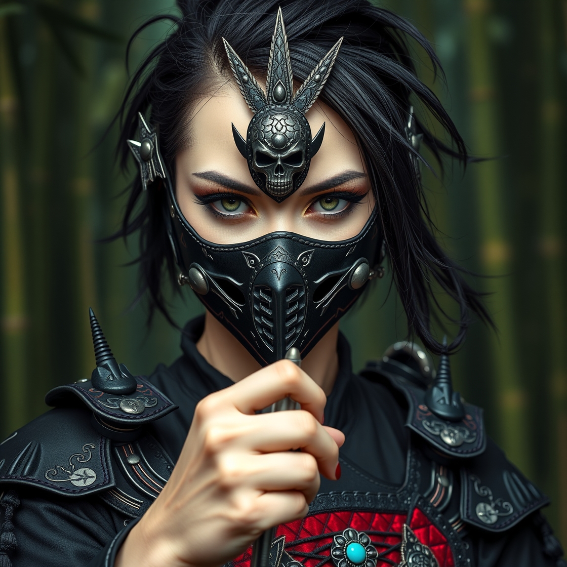 1girl, beautiful pwoman, black hair, short messy hair, 25 yo,, ((beautiful smile))), black lips,(exotic dancer on a stage :0.9), detailed eyes, photorealistic eyes, distance shoot, green eyes, black eye shadow, eye liner, big eyelashes, A photorealistic full-body vertical portrait of a fierce emo samurai girl with pale skin and sharp, aggressive features. She wears intense goth makeup: heavy black eyeliner, dark eyeshadow, and a cold, defiant gaze. Her expression is intimidating and powerful. She dons a dark, gothic-style mengu mask with spiked elements, skull motifs, and intricate metallic engravings. Her tribal-style samurai armor is infused with goth-punk aesthetics—black leather, crimson velvet inlays, turquoise threadwork, and jagged ornamental patterns. Her stance is strong and confrontational in a moonlit bamboo forest. The atmosphere is moody and cinematic, with soft bokeh, dramatic lighting, and a grainy 16mm film look. Highly detailed, rich in emo and goth influence, with no text or letters in the image. Simulating Kodak Ektacolor Pro 160, with a custom white balance at 5500K. cinematic lighting, analog film, film grain, kodak chrome, cool cinematic tones,high contrast, sharp details, with moody lighting that adds depth,. (cinematic atmosphere:1.3), deep photo, depth of field, (black hair)), , (ambient occlusion), (cinematic lighting:1.3), (4K image quality:1.3), (sharp detail:1.3), (highly realistic:1.3), (dim warm cinematic lighting:1.3)