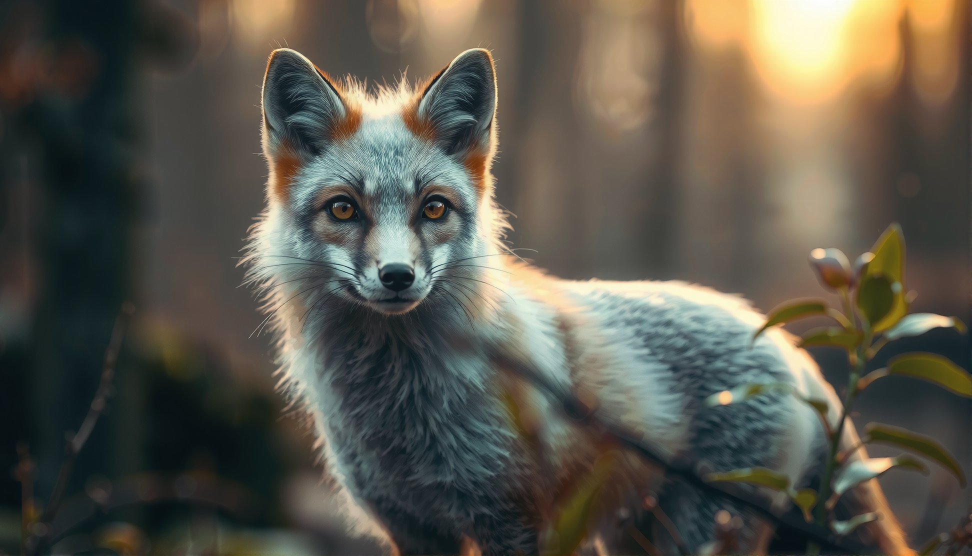 cinematic photo A silver fox with smooth, silvery fur stands quietly in a serene forest clearing. Its large, expressive eyes glisten with golden highlights as it gazes at the distant horizon. The soft lighting casts a warm glow over its fur and captures the faintest hints of greenery against a backdrop of deep brown tones for depth and contrast. The fox's expression is calm, with its ears perked and tail coiled, exuding quiet confidence. Whiskers curl gracefully around its face, adding detail to its graceful figure. A gentle breeze rustles nearby leaves, creating a sense of peace and isolation, emphasizing the magical moment captured in this image., 35mm photograph, film, professional, 4k, highly detailed