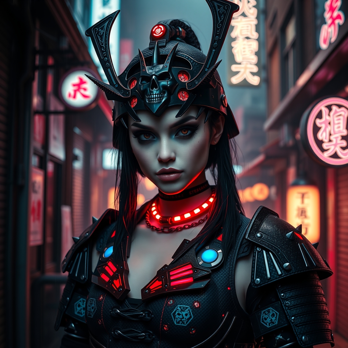 A photorealistic full-body vertical portrait of a fierce goth vampire samurai girl with pale skin and sharp, aggressive features, set in a dystopian Neo-Tokyo inspired by Blade Runner. She has intense goth makeup with heavy black eyeliner and dark eyeshadow, and a cold, defiant gaze. Her mengu mask is gothic and futuristic, with skull motifs, spiked edges, and glowing engravings in neon red and electric blue. Her samurai armor blends tribal and cyberpunk influences: black carbon fiber plates, crimson LED accents, turquoise circuitry, and angular, tech-enhanced design elements. She stands confidently in a rain-slick neon-lit alley, surrounded by holograms, mist, and glowing kanji signage. The atmosphere is dark, cinematic, grainy like 16mm film, and full of cyberpunk tension. No text or letters appear in the image. The atmosphere is moody and cinematic, with soft bokeh, dramatic lighting, and a grainy 16mm film look. Highly detailed, rich in emo and goth influence, with no text or letters in the image. Simulating Kodak Ektacolor Pro 160, with a custom white balance at 5500K. cinematic lighting, analog film, film grain, kodak chrome, cool cinematic tones,high contrast, sharp details, with moody lighting that adds depth,. (cinematic atmosphere:1.3), deep photo, depth of field, (black hair)), , (ambient occlusion), (cinematic lighting:1.3), (4K image quality:1.3), (sharp detail:1.3), (highly realistic:1.3), (dim warm cinematic lighting:1.3)