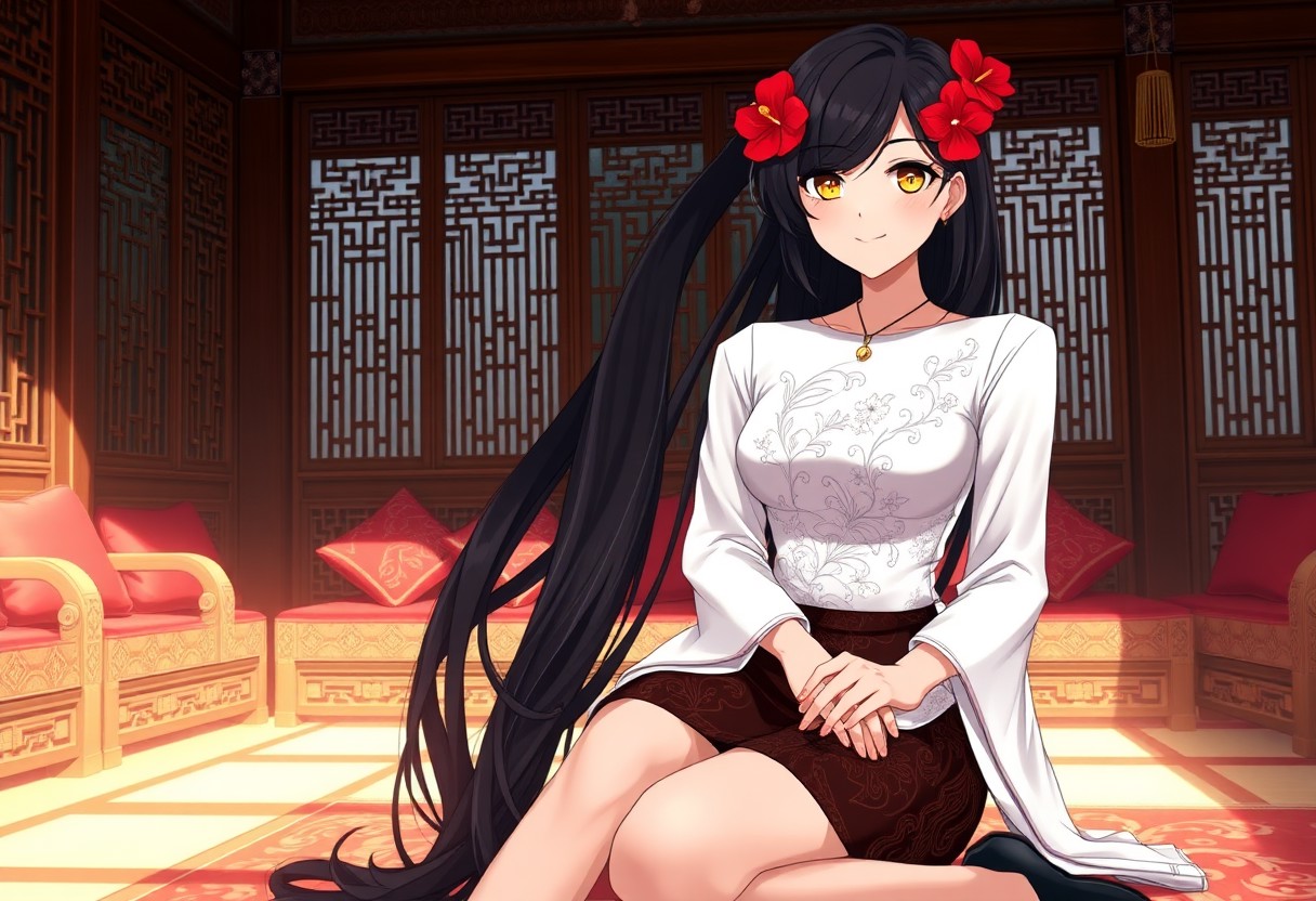 An anime-style depiction of a woman with long, silky black hair, adorned with bright red hibiscus flowers, sitting gracefully in a richly furnished traditional Indonesian room, bathed in soft, warm light. The room is a testament to the careful craftsmanship, featuring intricately carved wooden furnishings and plush, rich red cushions, contributing to the atmosphere of luxurious comfort. She is dressed in a stunning white kebaya, distinguished by its delicate floral motifs, elegant long sleeves, and intricate embroidery. Completing her look is a short, dark brown batik sarong skirt, which adds a layer of cultural heritage and charm. Her golden eyes radiate warmth and gentleness, complemented by the soft smile that softens her face. A delicate gold pendant necklace rests elegantly against her skin. Her black high heels add a touch of modern sophistication to the scene. This highly detailed, high-resolution image is rendered with soft, warm lighting, perfectly capturing the elegant aesthetic of the culture. The richness of Indonesia’s heritage and the graceful beauty of the woman are brought to life through painstaking detail, creating a harmonious visual narrative.