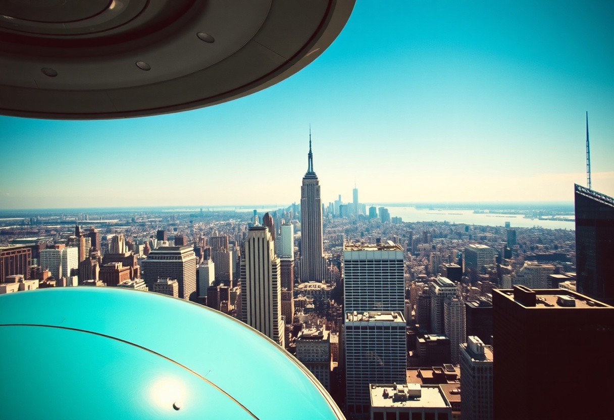 Spaceport, city view, new york, city skyline, retro,