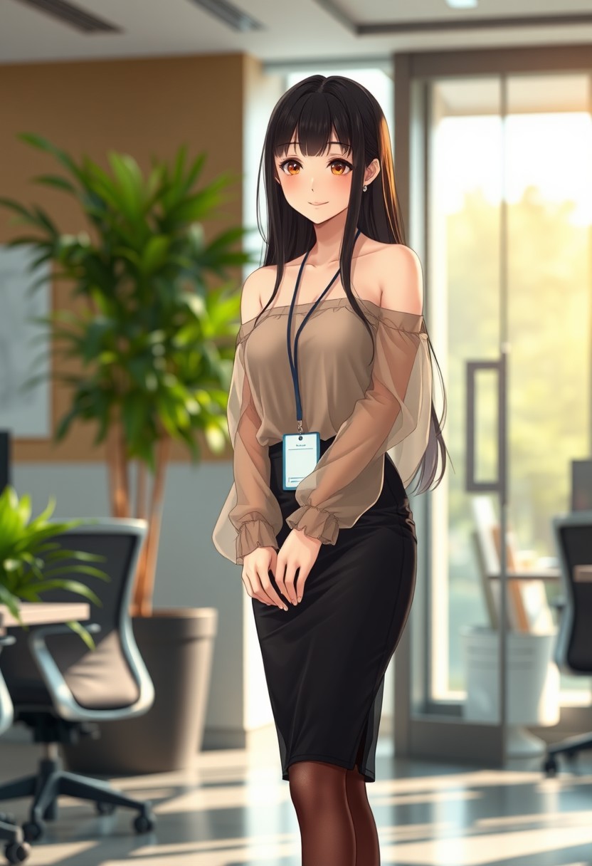 Anime-style shy and beautiful young female secretary standing in a modern office during the day. She has long, smooth black hair and gentle eyes, looking slightly down with a shy smile. She wears an elegant off-shoulder summer transparent thin blouse without straps, with long flowing sleeves, slightly sheer and soft, tucked into a fitted black pencil transparent mini skirt that ends just above the knees. She also wears thin, transparent black stockings and modest black heels. A small ID badge hangs subtly at her waist, adding to her reserved posture. Her cheeks are slightly flushed, giving a blushing expression as she stands near the office entrance, uncertain where to go. Background includes bright natural lighting, indoor plants, office desks, and soft shadows. The overall tone is warm and welcoming, with a soft-focus anime style and subtle bokeh effect in the background. Full-body composition, delicate lighting, cinematic mood.