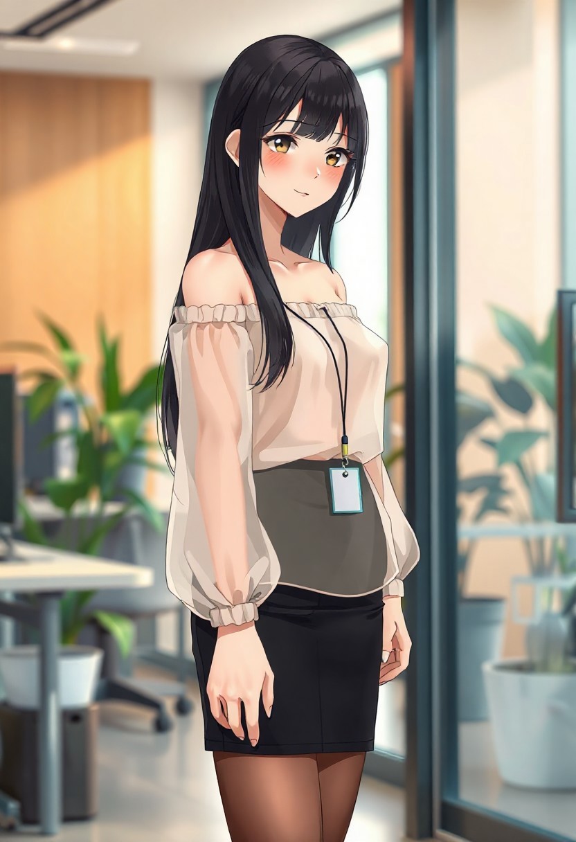 Anime-style shy and beautiful young female secretary standing in a modern office during the day. She has long, smooth black hair and gentle eyes, looking slightly down with a shy smile. She wears an elegant off-shoulder summer transparent thin blouse without straps, with long flowing sleeves, slightly sheer and soft, tucked into a black pencil transparent very mini skirt that ends just above the knees. She also wears thin, transparent black stockings and modest black heels. A small ID badge hangs subtly at her waist, adding to her reserved posture. Her cheeks are slightly flushed, giving a blushing expression as she stands near the office entrance, uncertain where to go. Background includes bright natural lighting, indoor plants, office desks, and soft shadows. The overall tone is warm and welcoming, with a soft-focus anime style and subtle bokeh effect in the background. Full-body composition, delicate lighting, cinematic mood.