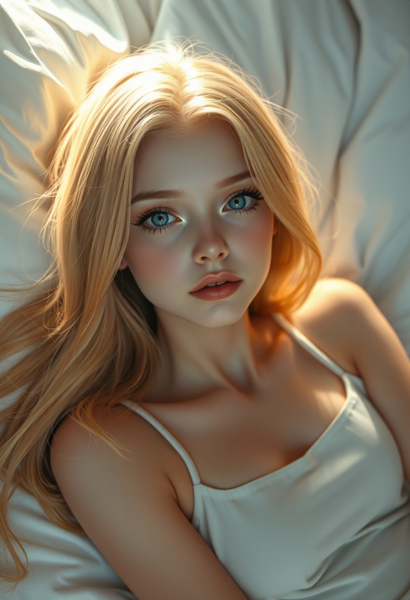 masterpiece, best quality, ultra-detailed, high resolution, digital painting, cinematic lighting, soft shading, perfect anatomy, sharp focus, beautiful face portrait orientation, 8k resolution, symmetrical composition, depth of field, glowing light, subsurface scattering, vibrant colors A breathtaking hyperrealistic-style girl with long flowing golden glowing sunlit blonde hair, soft blue eyes, flawless glowing skin, long eyelashes, A breathtaking anime-style girl with long flowing blonde hair, soft blue eyes, flawless glowing skin, wearing a light, sleeveless white top or dress, calm and serene expression, delicate and elegant facial features, relaxed body language, calm and serene expression, delicate and elegant features, soft curves, intrepid gaze, perfectly glossed soft pink lips, gorgeous small medium breasts, Lying peacefully on a soft white bed with crisp sheets, gentle natural light filtering in, slight shadows adding depth to her form, subtle warmth in the lighting, cozy and intimate atmosphere, background blurred to keep focus on her