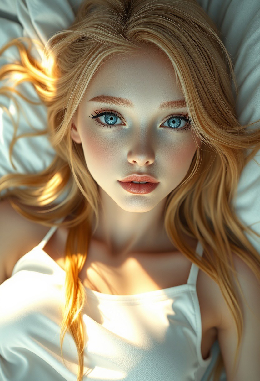 masterpiece, best quality, ultra-detailed, high resolution, digital painting, cinematic lighting, soft shading, perfect anatomy, sharp focus, beautiful face portrait orientation, 8k resolution, symmetrical composition, depth of field, glowing light, subsurface scattering, vibrant colors A breathtaking hyperrealistic-style girl with long flowing golden glowing sunlit blonde hair, soft blue eyes, flawless glowing skin, long eyelashes, A breathtaking anime-style girl with long flowing blonde hair, soft blue eyes, flawless glowing skin, wearing a light, sleeveless white top or dress, calm and serene expression, delicate and elegant facial features, relaxed body language, calm and serene expression, delicate and elegant features, soft curves, intrepid gaze, perfectly glossed soft pink lips, gorgeous small medium breasts, Lying peacefully on a soft white bed with crisp sheets, gentle natural light filtering in, slight shadows adding depth to her form, subtle warmth in the lighting, cozy and intimate atmosphere, background blurred to keep focus on her