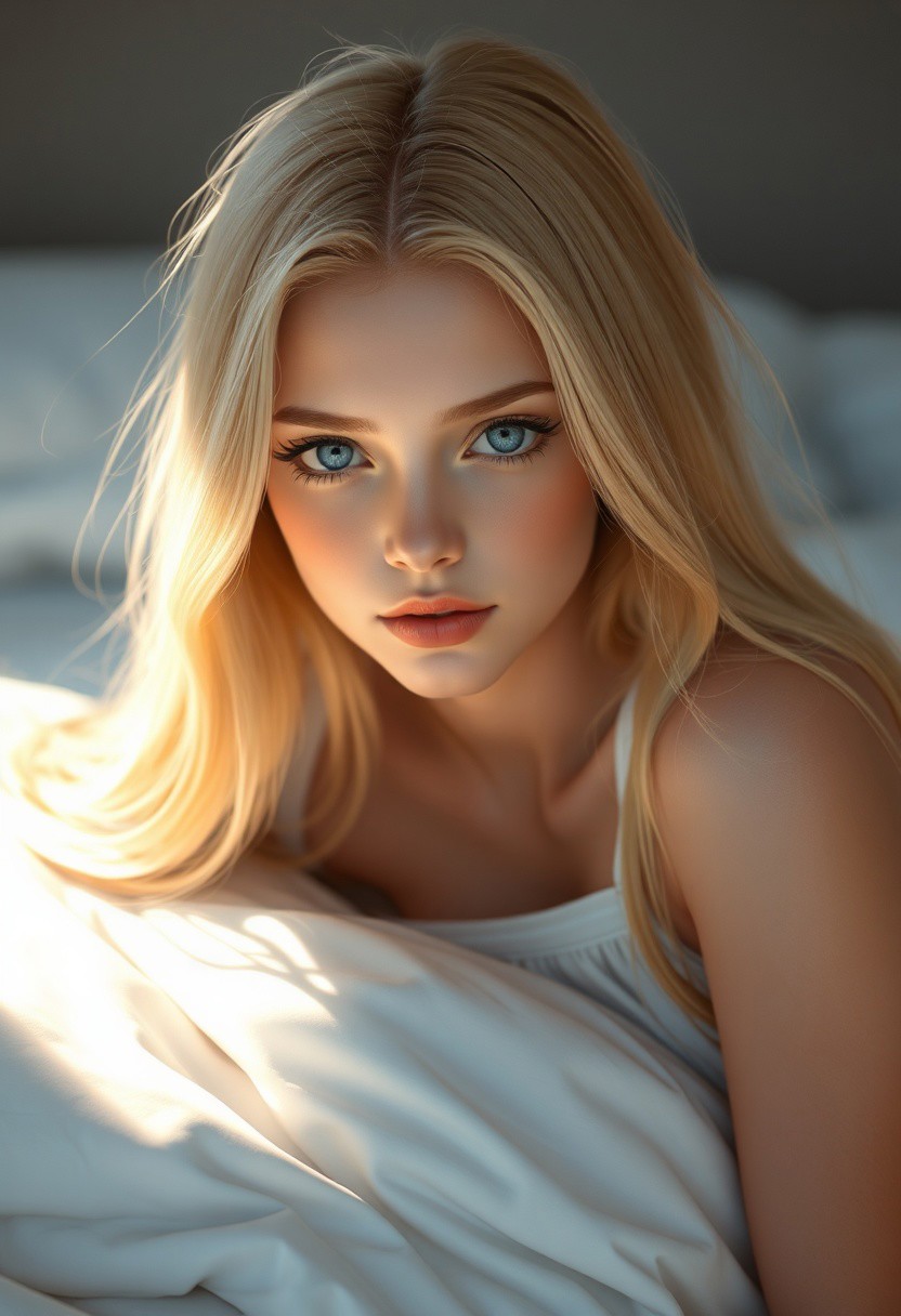 masterpiece, best quality, ultra-detailed, high resolution, digital painting, cinematic lighting, soft shading, perfect anatomy, sharp focus, beautiful face portrait orientation, 8k resolution, symmetrical composition, depth of field, glowing light, subsurface scattering, vibrant colors A breathtaking hyperrealistic-style girl with long flowing golden glowing sunlit blonde hair, soft blue eyes, flawless glowing skin, long eyelashes, A breathtaking anime-style girl with long flowing blonde hair, soft blue eyes, flawless glowing skin, wearing a light, sleeveless white top or dress, calm and serene expression, delicate and elegant facial features, relaxed body language, calm and serene expression, delicate and elegant features, soft curves, intrepid gaze, perfectly glossed soft pink lips, gorgeous small medium breasts, Lying peacefully on a soft white bed with crisp sheets, gentle natural light filtering in, slight shadows adding depth to her form, subtle warmth in the lighting, cozy and intimate atmosphere, background blurred to keep focus on her
