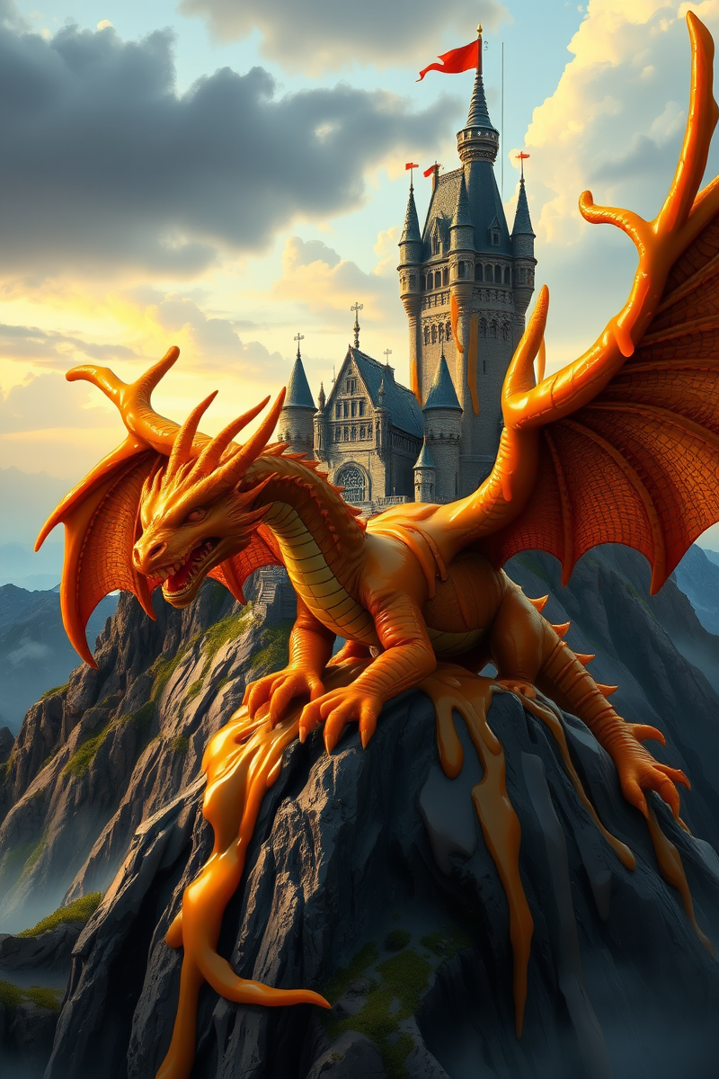 caraf, artistic fantasy painting of a caramel dragon guarding a big castle on top of a hill. stunning scenery, early morning light, deep shadows. The castle is made of caramel.