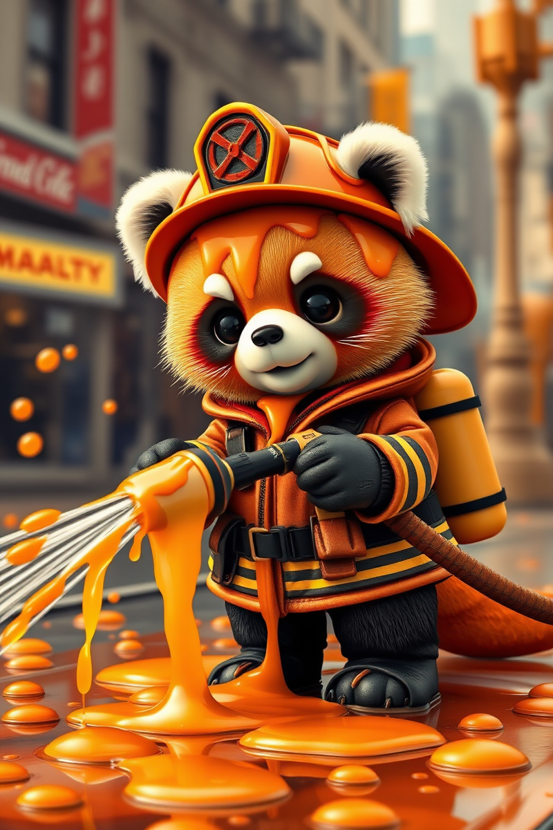 caraf, a cute caramel panda wearing a firefighter uniform. Spraying caramel all over the place with a firehose. city, urban environment,