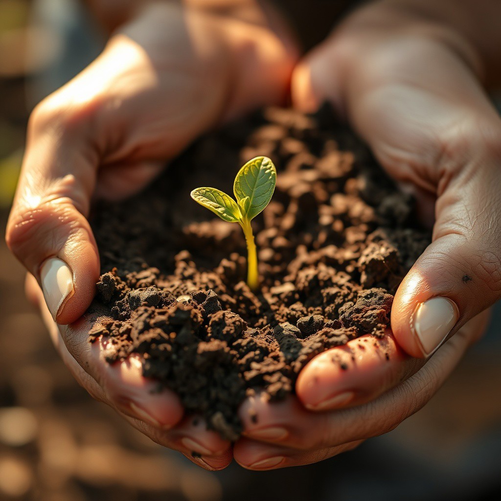 Gentle cupped hands holding rich, dark soil with a delicate green seedling emerging, tiny tender leaves unfurling, soft natural lighting creating a warm glow, shallow depth of field focusing on the fragile plant, hands positioned as if protecting and nurturing the young life, fine details visible in the soil texture and delicate leaf veins, symbolic of hope and new beginnings, serene and peaceful atmosphere, macro photography style, golden hour lighting, earth tones with vibrant green contrast, Morning dew droplets on the leaves,Soft sunbeams filtering through, Weathered, caring hands,
