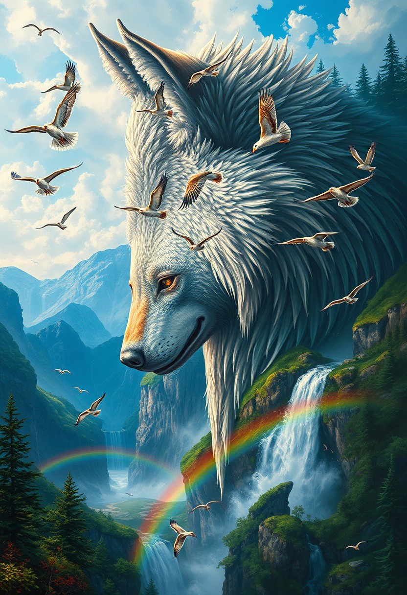A painting of a majestic continent, a continent shaped like a wolf's face, with migratory birds taking flight from the vast wilderness. There are numerous waterfalls and rainbows. best quality, sharp focus, high contrast, colorful, ultra quality, 8k, best quality ,Oil Painting,