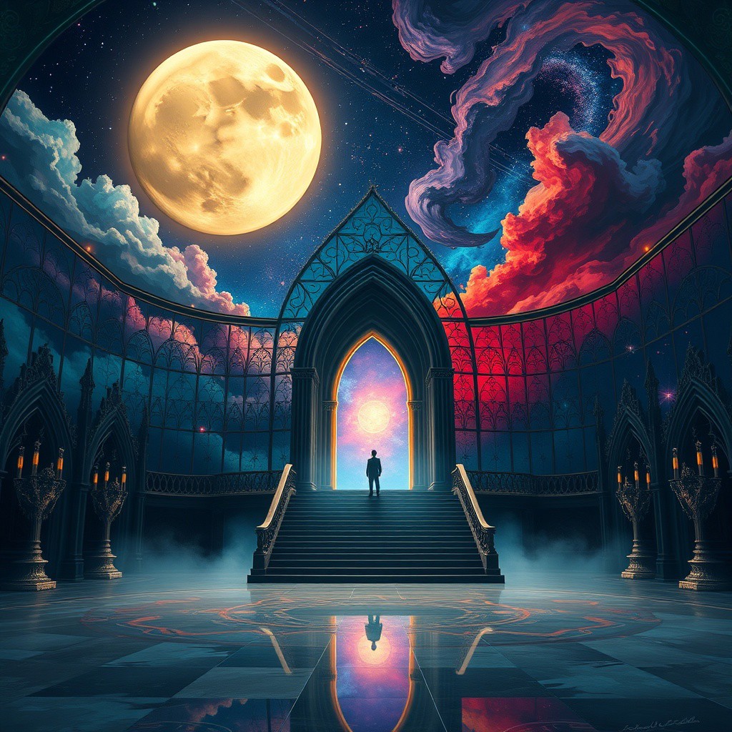 masterpiece, best quality, ultra highres, original, extremely detailed, perfect lighting, dark glass palace under a celestial sky, surreal cosmic throne hall with arched gothic architecture, glowing twin moons, swirling galaxies beyond a grand portal, mist-filled chamber, reflective marble floor, colorful nebulous clouds in turquoise, violet, and crimson, intricate art nouveau ornamentation, lone figure standing on staircase bathed in radiant portal light, fantasy concept art, bold brushstrokes, dreamlike atmosphere, high detail painting, digital art, ethereal lighting, magical surrealism
