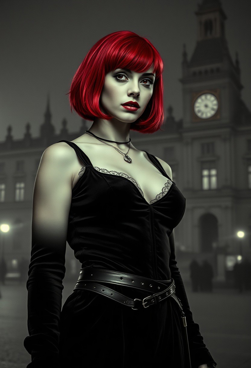 A black and white aged photograph from 1915 of 35 year old Female vampire 1500s fashion, muscular , pale light greenish skin , very beautiful , busty , wearing velour pantsuit . Red eyes , leather belts with a rapier , bright red hair in a bob hairstyle , in front of the house of parliament UK night and foggy