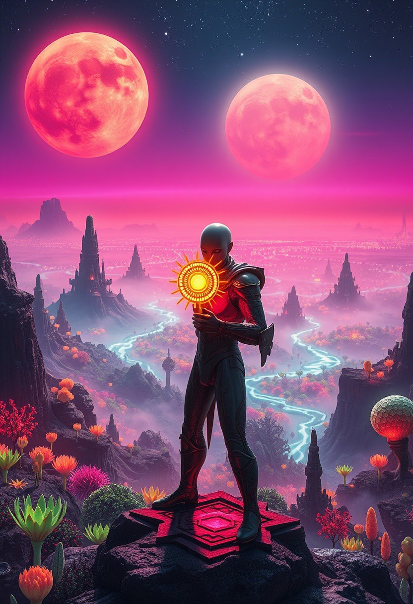 A surreal alien world drenched in an otherworldly glow, illuminated by two massive suns that paint the horizon in cascading neon hues. The foreground features a humanoid figure in a heroic, dynamic stance, holding a strange artifact glowing with ancient power, symbolizing destiny and cosmic fate. The landscape stretches endlessly, covered in pulsating bioluminescent plants, alien crystal forests, and strange geometrical monoliths that emit eerie, low-frequency vibrations. A shimmering mist rises from glowing rivers, adding to the sense of ethereal mystery, while the distant skyline shows colossal, floating cities shaped like intricate seashells. HDR and UHD clarity reveal every microscopic detail of this magical and horrifyingly beautiful world: from the figure’s armor reflecting surreal lighting to the eerie alien fauna crawling in the background. The mood balances tranquility and vibrancy, whimsical wonder and subtle horror, giving a cinematic impression of a vivid painting brought to life. Evocative long exposure streaks give the illusion of cosmic winds and otherworldly energy surging across the sky, blending surreal fantasy with science fiction into one majestic, timeless scene.