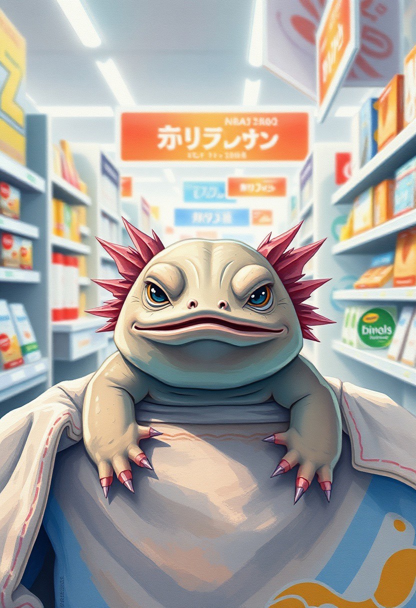 "(masterpiece, best quality, high quality, highres), very awa, highres, absurdres, (chii-kun \(seedyoulater\):0.7), (naguru \(cyoroama\):0.7)water color painting, rough canvas, rough surface, (axolotl:1.1), (no humans:1.1), (cute:1.2), comfy, solo, cozy, indoors, shoping, market, sunny day, consumer goods, supermarket, frown, oil painting, depth of field, cinematic, "