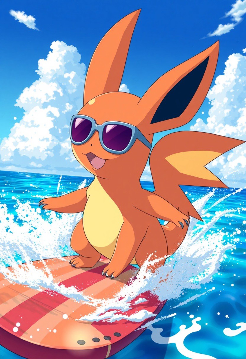 masterpiece, best quality, anime screencap, solo, zzCharmeleon, surfing, ocean, sunglasses, ,<lora:CharmeleonPokedex_IXL_v1:1.0>,
