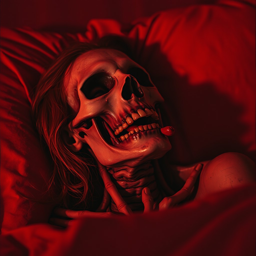 Album cover of realistic Dark art close up movie still of a undead zombie woman from the 70s-style pulp paintings lying in bed in a eerie red hotel room licking her necrotic lips with a naughty look on her face, The vibe is red and otherworldy. The zombie womans skeletal face is looking blissful. Duotone: Burnt orange and deep plum. Mood: Occult ritual meets 80's concert poster art style, movie still, gore, sexy, flirty, amorous, beautiful, evil dead