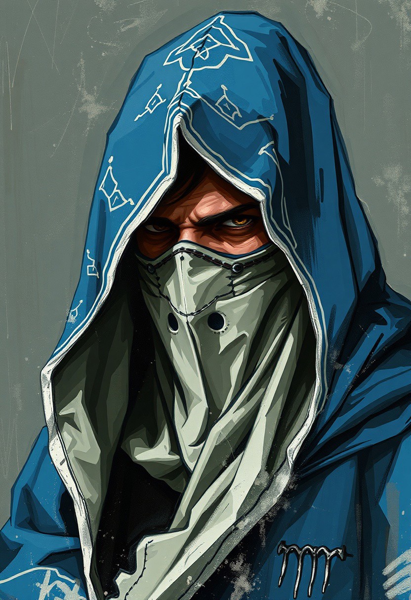 Hooded wizard, blue hood, white trim, mask, rendered with bold, expressive smudges and unfinished strokes, art nouveau, atmospheric, painterly