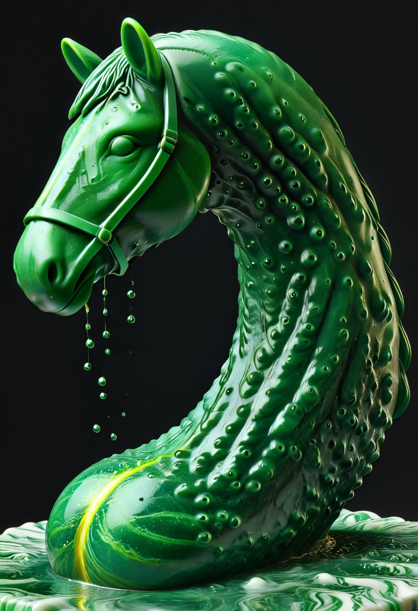 best quality, masterpiece, high resolution, intricate detailed, (horse sculpture:1.1) made of green Liquid Marble, melting, wavy, bubbles, made out of dvr-pckl, high detail, gold veins, ethereal, majestic, detailed digital art, close up, ground shot, dark background,