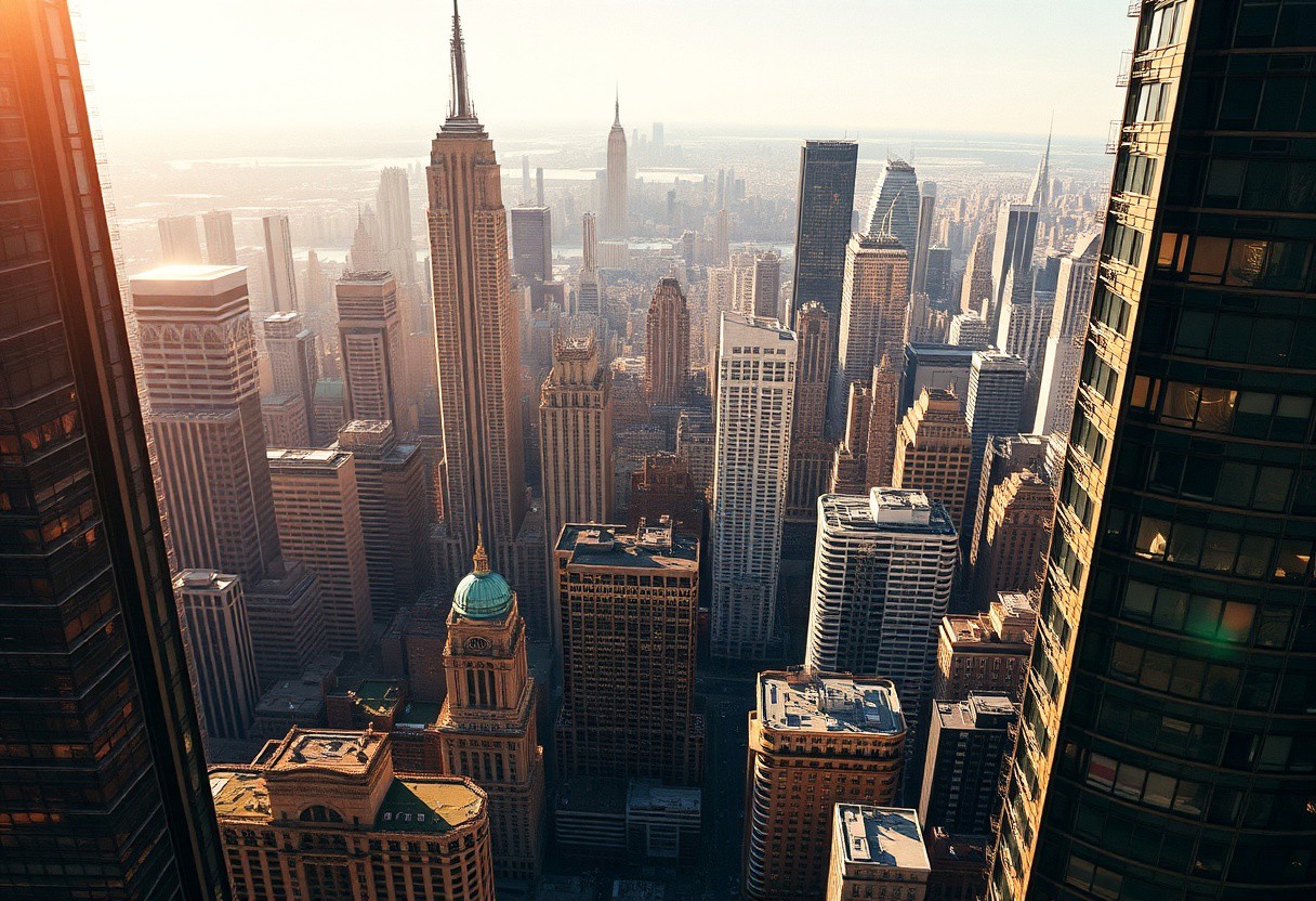 city view, new york, city skyline, retro, aerial view, daylight, sunny day, future, retro future, megalopolis, futuristic skyscrapers, dredd,