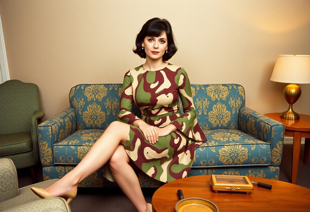 masterpiece portrait of seated woman in 1960s mini dress::1.4, 1960s vintage magazine style::1.2, mid-century retro art::1.1, (physical description: adult woman seated on armrest of floral sofa, legs crossed, long-sleeved mini dress with bell sleeves, psychedelic green-brown-cream pattern:1.1), (facial features, expression: neutral expression, facing forward, soft makeup with a subtle 60s flair:1.0), (clothing details: abstract-patterned mini dress in green, brown, and cream tones, hem mid-thigh, fabric draped naturally:1.0), (accessories: none prominent, understated style typical of 1960s casual fashion:0.9), (background setting: mid-century living room with blue and yellow floral sofa, green armchair, wooden coffee and end tables with ashtrays and a vintage lamp:0.9), (lighting style: warm ambient lighting with slight yellow-orange cast typical of incandescent bulbs:0.8), (composition and camera framing: straight-on eye-level shot, full figure in seated pose with room elements framed behind:1.0), (emotional tone or theme: relaxed domesticity with a subtle retro elegance, casual yet composed:0.9), (technical execution: grainy texture reminiscent of 1960s film photography, slight vignetting, soft shadows:0.8)