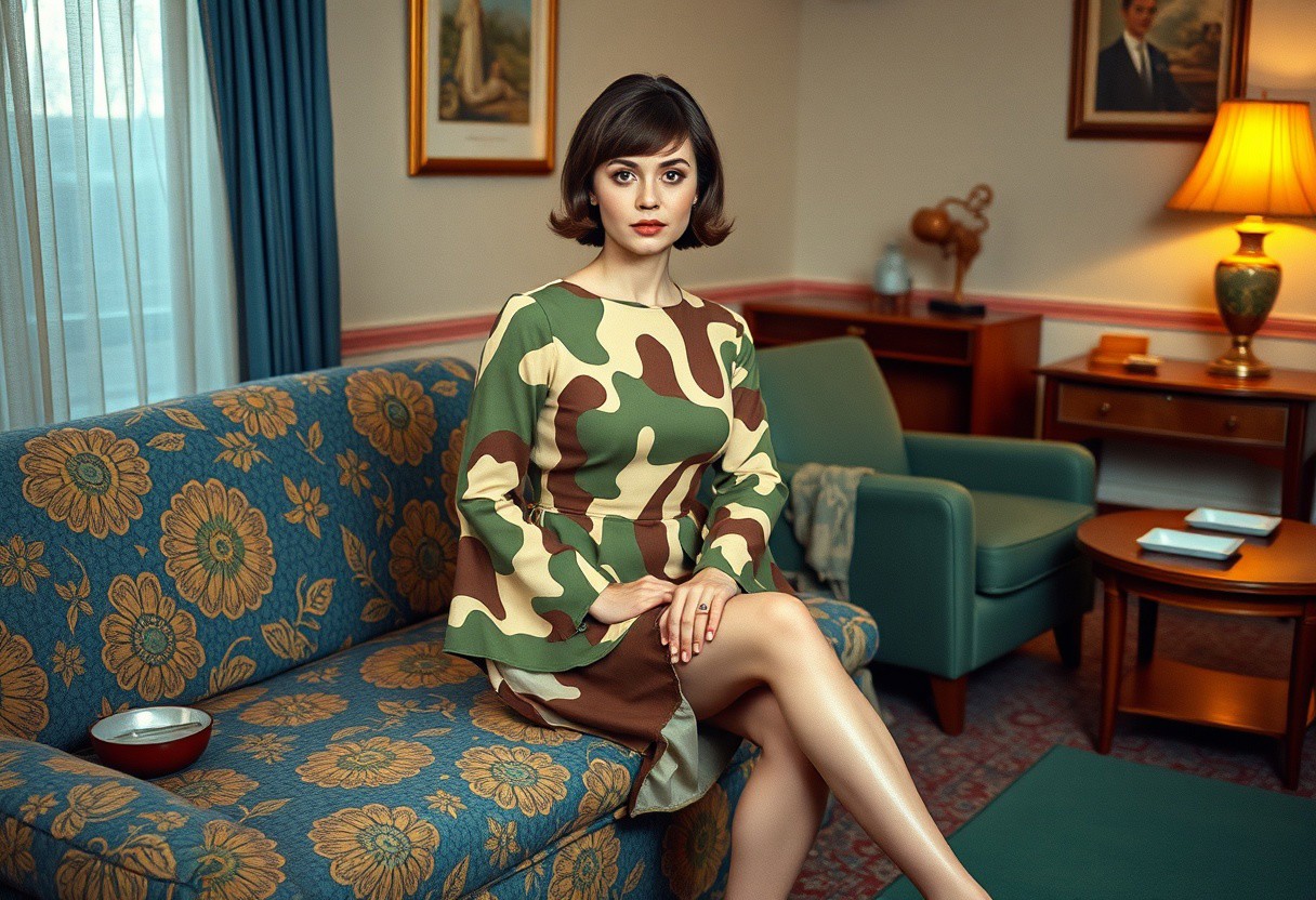 masterpiece portrait of seated woman in 1960s mini dress::1.4, 1960s vintage magazine style::1.2, mid-century retro art::1.1, (physical description: adult woman seated on armrest of floral sofa, legs crossed, long-sleeved mini dress with bell sleeves, psychedelic green-brown-cream pattern:1.1), (facial features, expression: neutral expression, facing forward, soft makeup with a subtle 60s flair:1.0), (clothing details: abstract-patterned mini dress in green, brown, and cream tones, hem mid-thigh, fabric draped naturally:1.0), (accessories: none prominent, understated style typical of 1960s casual fashion:0.9), (background setting: mid-century living room with blue and yellow floral sofa, green armchair, wooden coffee and end tables with ashtrays and a vintage lamp:0.9), (lighting style: warm ambient lighting with slight yellow-orange cast typical of incandescent bulbs:0.8), (composition and camera framing: straight-on eye-level shot, full figure in seated pose with room elements framed behind:1.0), (emotional tone or theme: relaxed domesticity with a subtle retro elegance, casual yet composed:0.9), (technical execution: grainy texture reminiscent of 1960s film photography, slight vignetting, soft shadows:0.8)