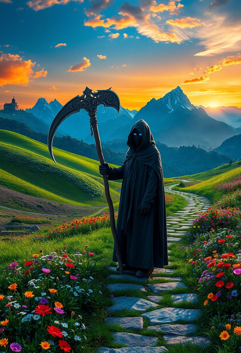 (masterpiece), best quality, expressive eyes, perfect face, vibrant color, A cloaked figure with glowing blue eyes stands in a vibrant valley filled with colorful flowers. The figure holds a large, ornate scythe and is positioned along a winding stone path that stretches through lush green fields. In the background, majestic mountains rise against a stunning sunrise, illuminating the sky with warm hues. An ancient building can be seen on a distant hill, adding a mystical atmosphere to the serene landscape.