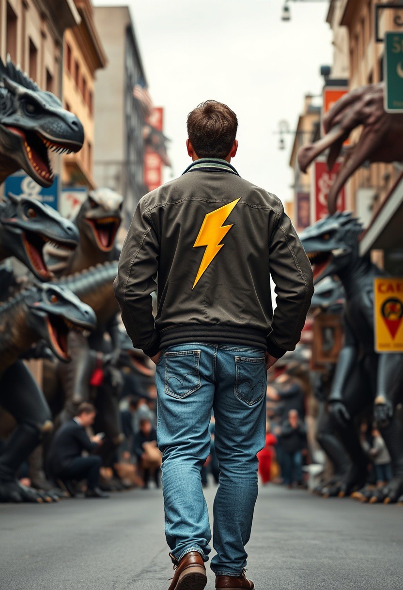 the back view of a man with jeans and a jacket with a yellow bolt logo with his hands in his pocket walking in a crazy street in the middle of monsters, dinosaurs, samurais, robots, fantasy characters and movie characters
